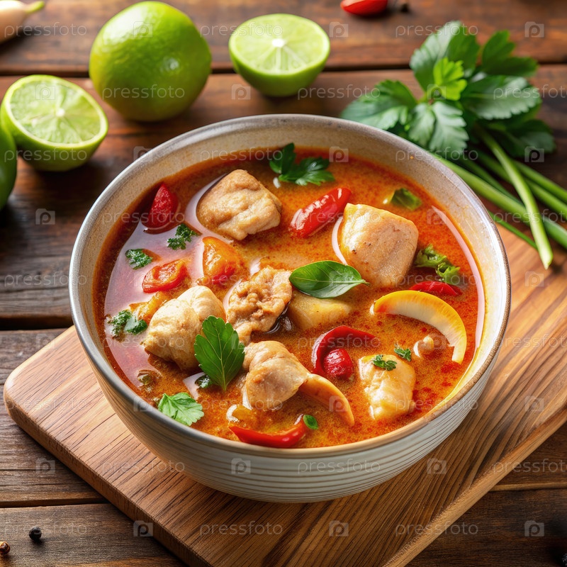 Вкусная курица Том Йам подается в миске с свежими травами и ломтиками лайма