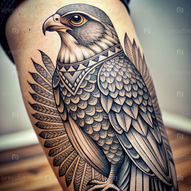 Подробный черно-серый эскиз татуировки сокола на ноге. генеративная ИИ