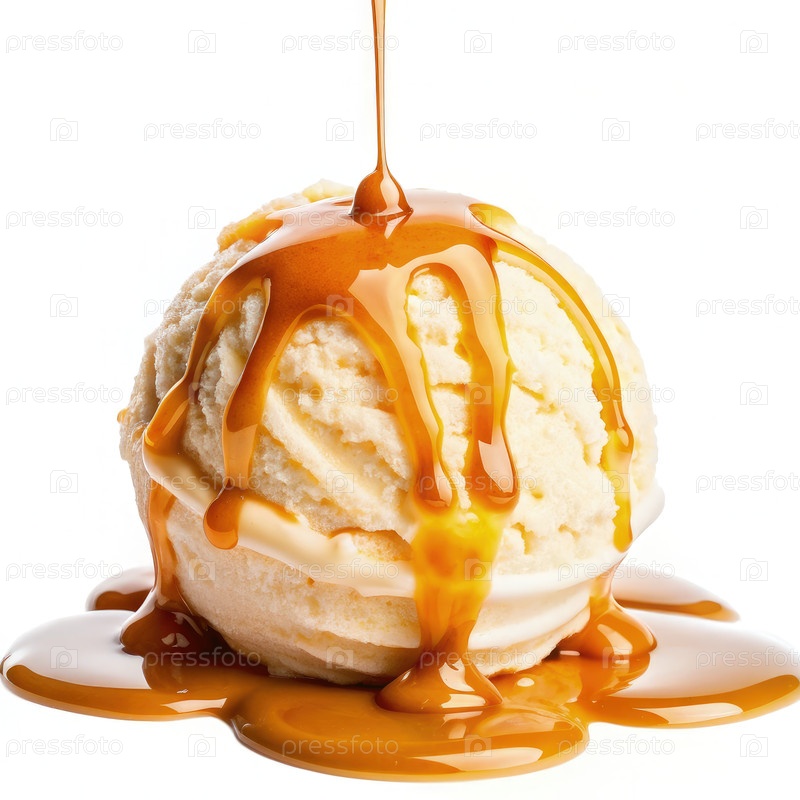 Сверкающий карамельный соус над ванильным мороженым. генеративный AI