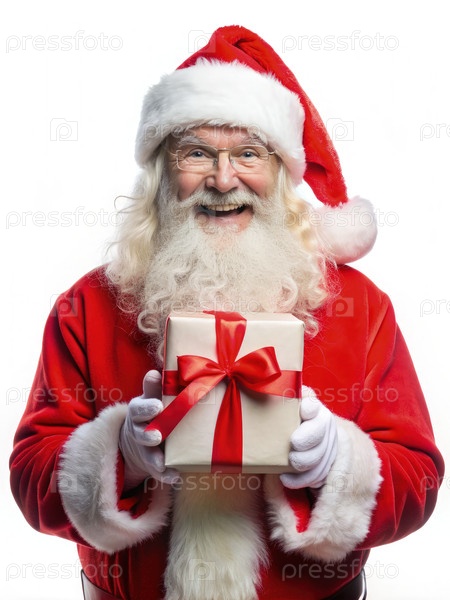 Веселый Санта-Клаус держит праздничный подарок на ярко белом фоне