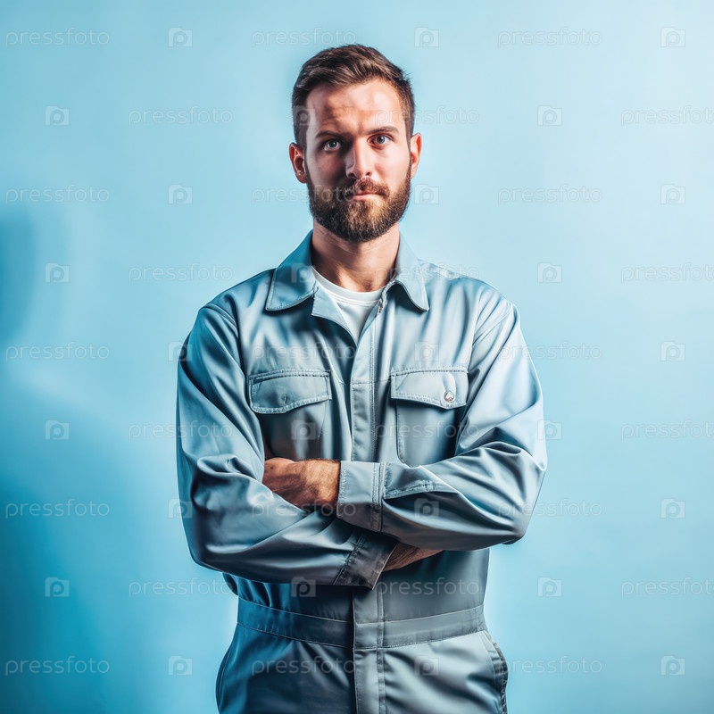 Мужчина в синей рабочей форме уверенно позирует на монохромном голубом фоне