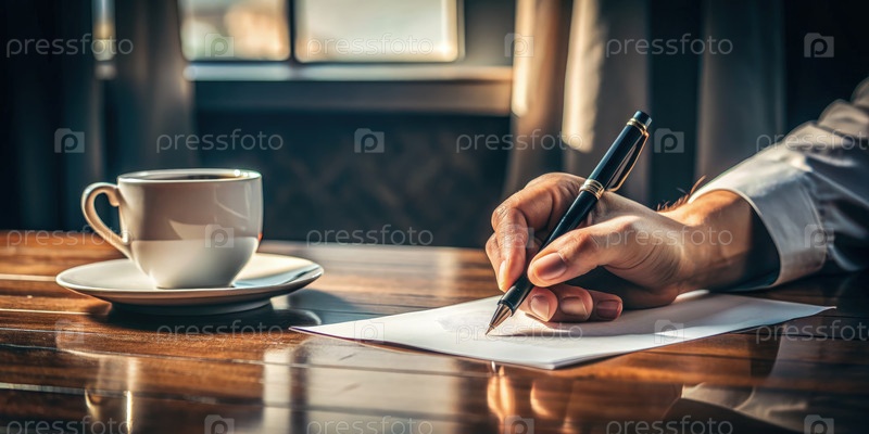 Рукопись на бумаге с ручкой рядом со стаканом кофе в уютной помещенной обстановке при дневном свете