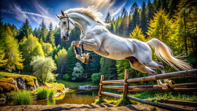 Белый конь грациозно прыгает через деревянный забор возле безмятежного озера, окруженного ярко-зелеными лесами в солнечный день