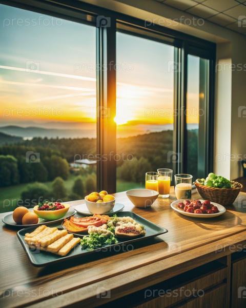 Уютная кухня на закате Подготовка вкусной еды с использованием свежих ингредиентов и яркого естественного света