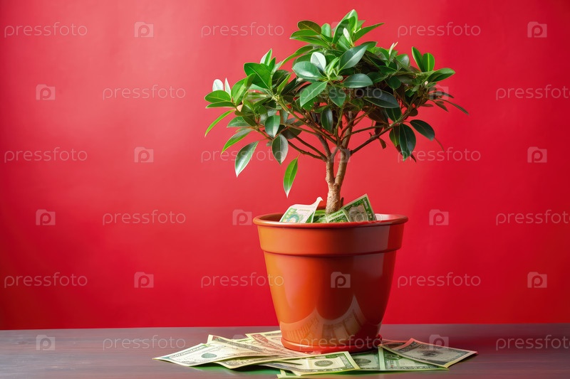 Древо денег, цветущее в декоративном горшке на смелом красном фоне