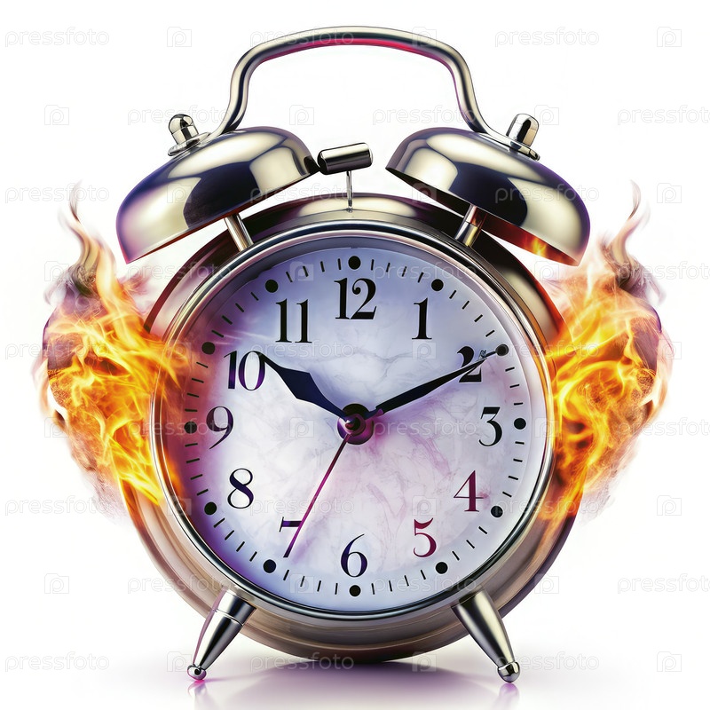 Серебряный будильник, горящий на белом фоне