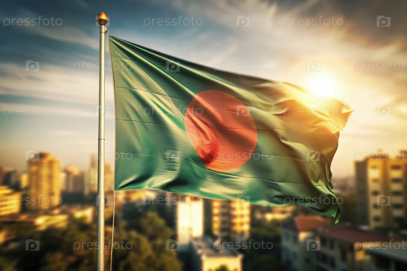 Флаг Бангладеш величественно летит над городским ландшафтом во время восхода солнца
