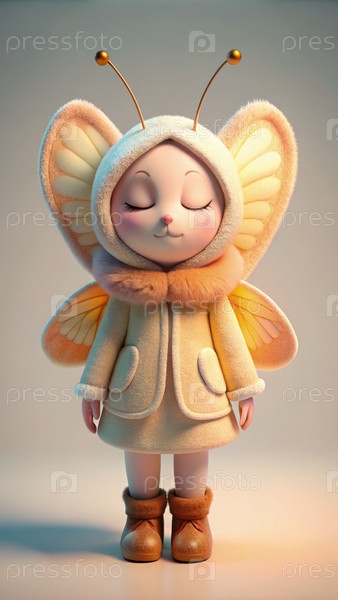 Милый антропоморфный персонаж бабочки в уютном наряде, стоящий изящно под мягким светом