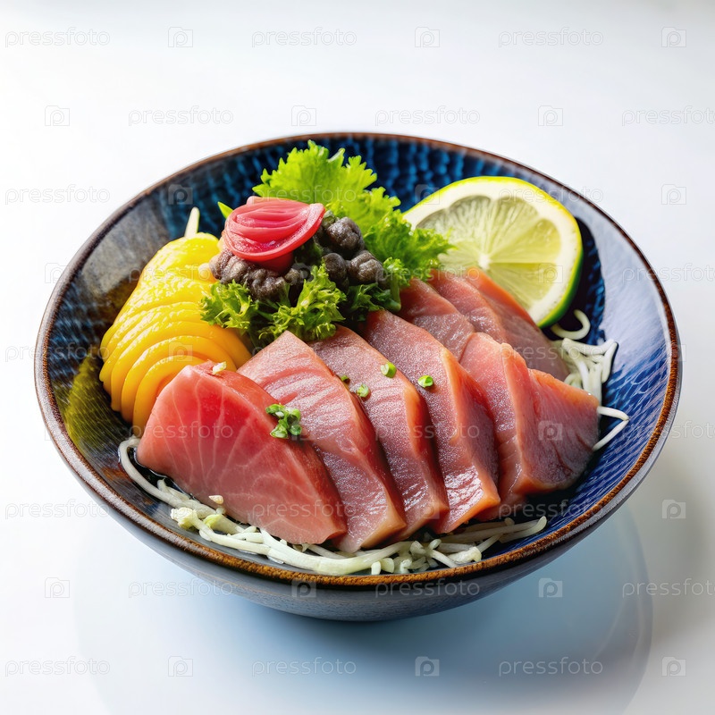 Сашими тунец, лайм и салат в голубой миске на белом фоне