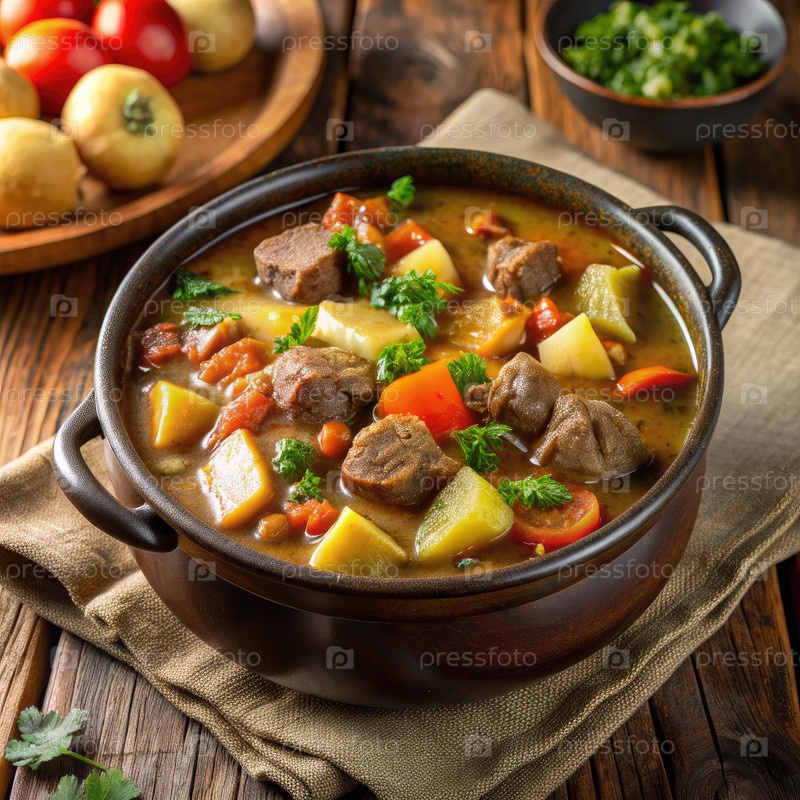 Пот сердечной говядины Сгущенное с овощами, подаваемое на деревянном рустическом столе