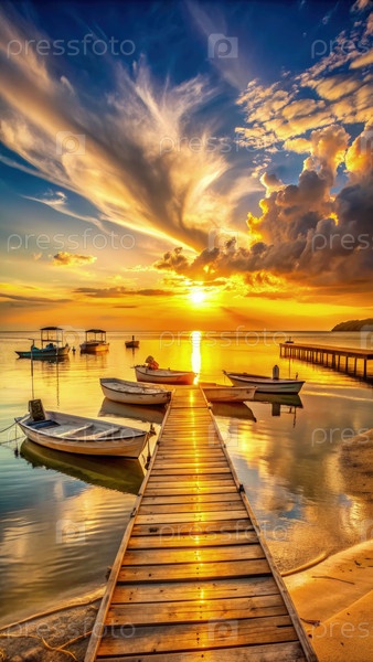 Красивый закат солнца над спокойным пляжем с лодками и пиром на закате