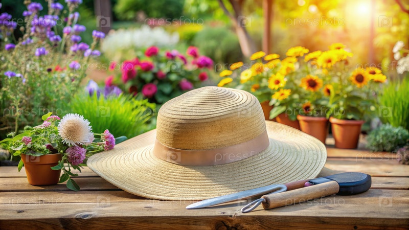 Соломенная садовая шляпа, отдыхающая на деревянном столе с цветами и инструментами