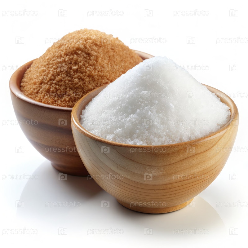 Две деревянные миски, содержащие сахар и соль на белом фоне в кухонной обстановке
