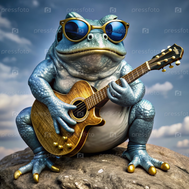 Гигантская голубая кварцевая жаба играет на акустической гитаре под ясным небом при закате