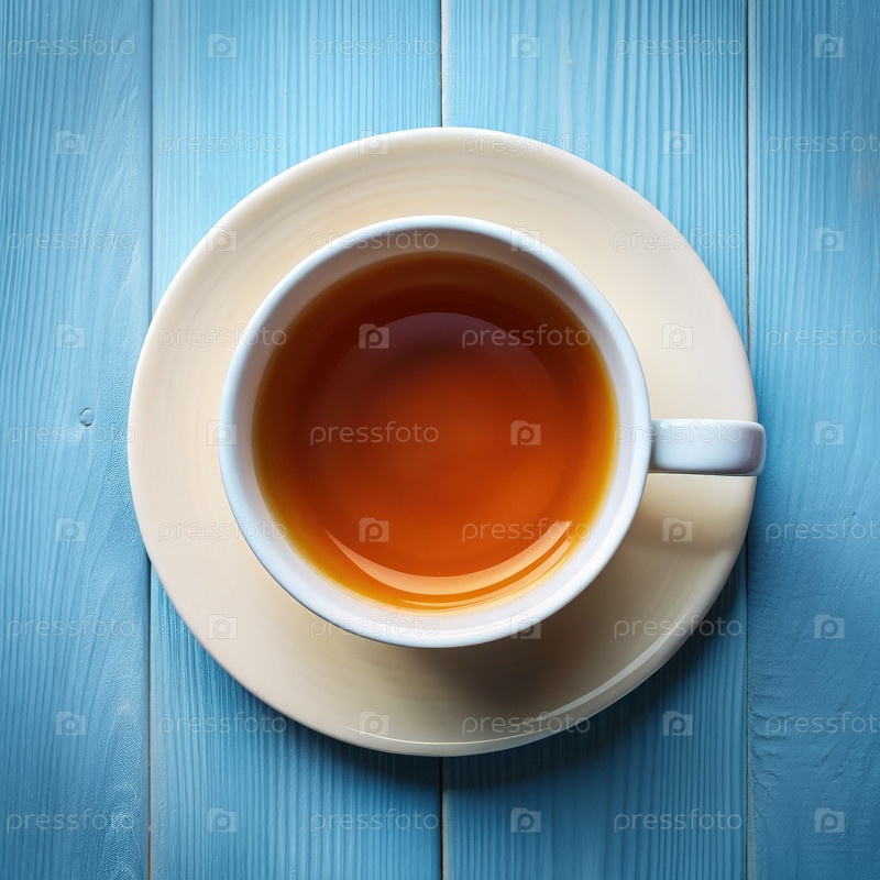 Вид сверху чашки чая на голубом деревянном столе