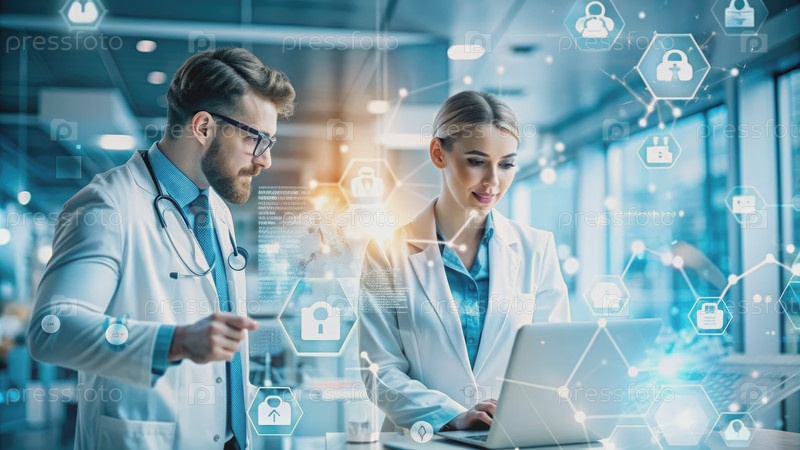 Специалисты здравоохранения анализируют данные в современной офисной обстановке