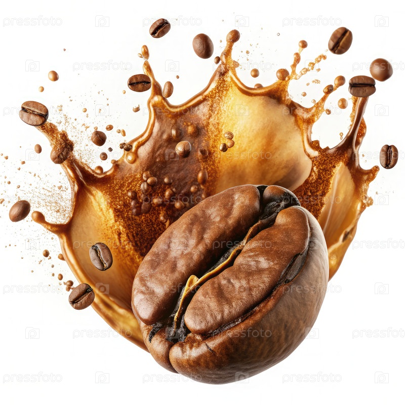 Кофейные бобы брызгут через жидкость кофе на белом фоне