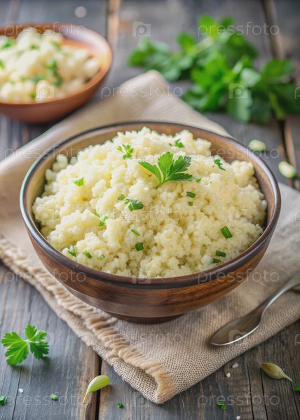 Ближайшее изображение сливочного кето-колокольчатого риса в коричневой миске. генеративный ИИ
