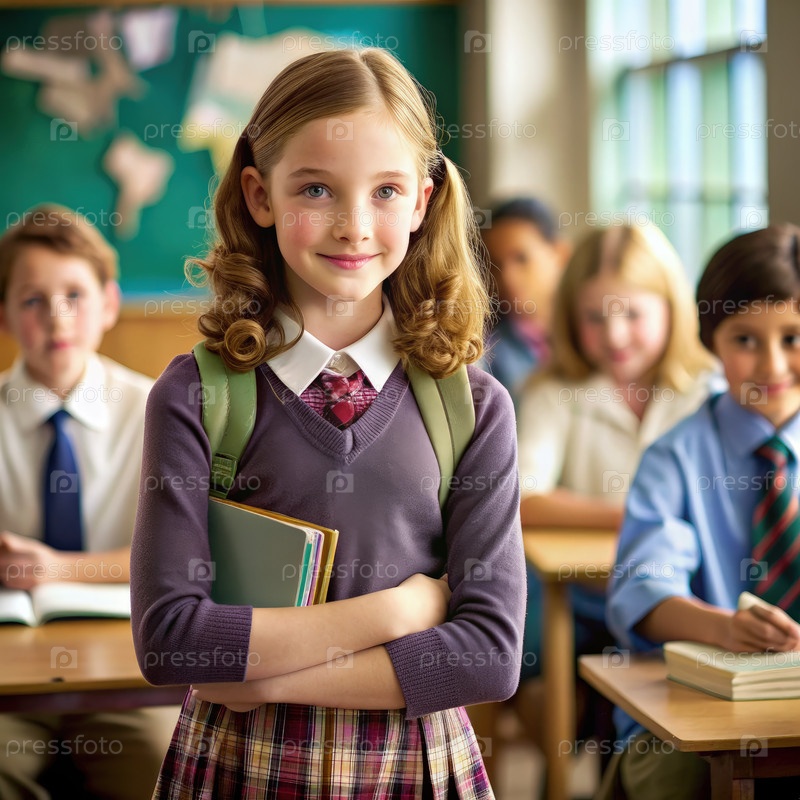 Девочка улыбается уверенно, держа книги в классе в июне