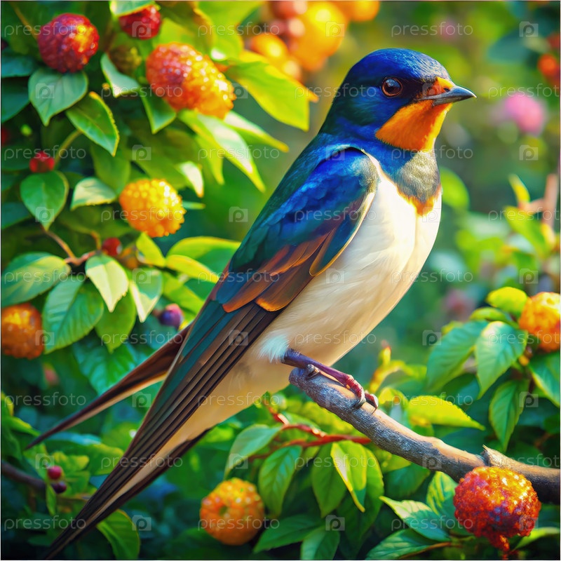 Синяя и белая ласточка, сидящая на ветке в пышном саду