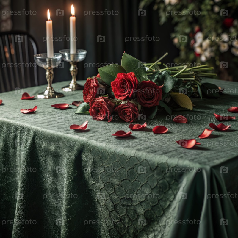 Элегантный пищевой опыт с красными розами на изумрудной скатерти с атмосферой под свечами