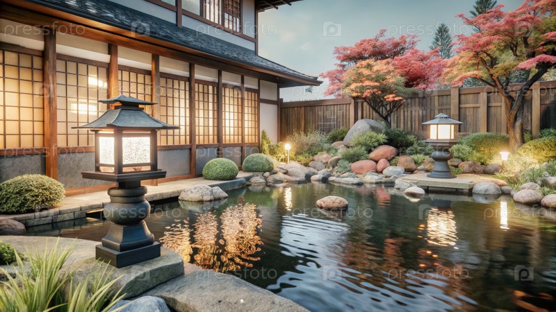 Спокойный японский сад с прудом Koi, окруженный пышными листьями и элегантными фонарями на закате