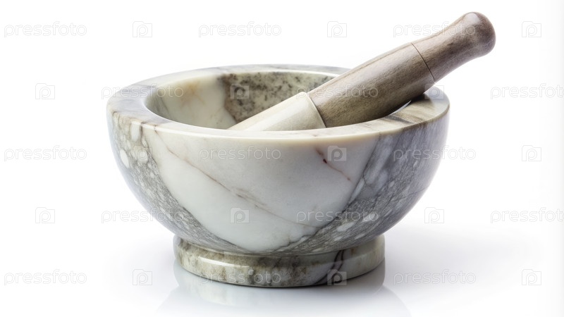 Белый мраморный миномет и пестл на столешнице. генеративная ИИ