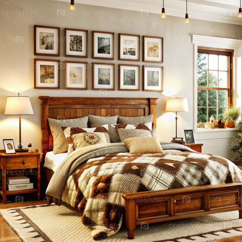 Уютная деревенская спальня с теплыми земными тонами, мягкими постельными принадлежностями и естественным светом через окна