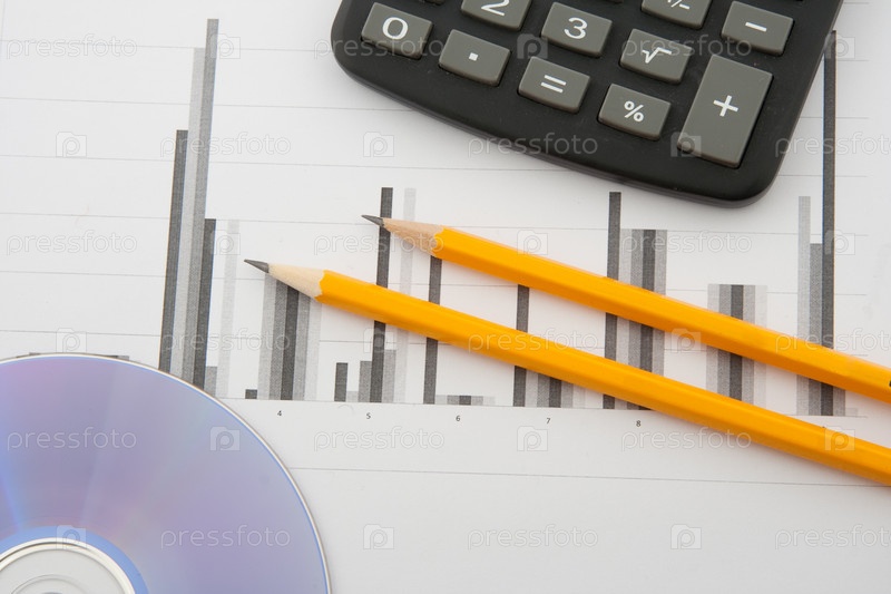 Карандаши, калькулятор и диск на фоне бизнес-графика