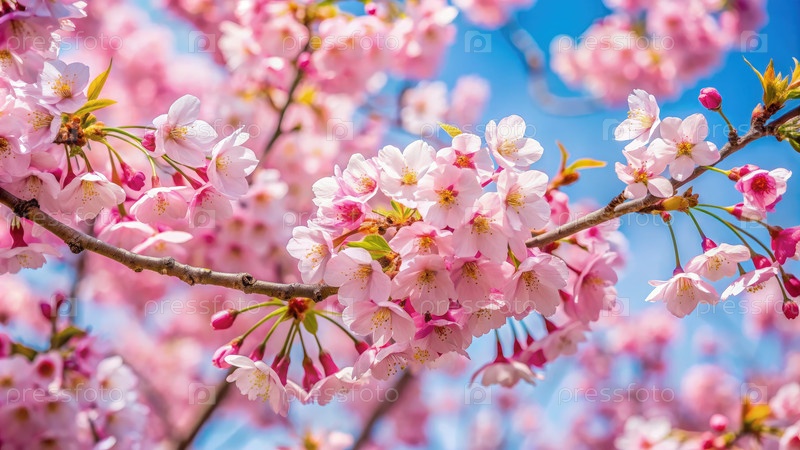 Потрясающий ближайший взгляд на ветви цветущих вишневых деревьев в полном цветении в яркий солнечный день