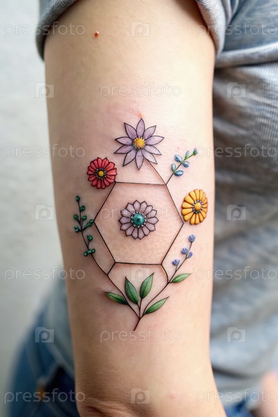 Минималистская гептагонная татуировка, украшенная красочными цветами на руке