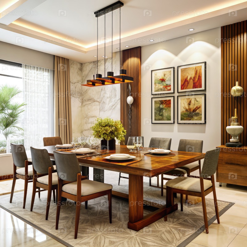Элегантная минималистическая столовая с натуральным светом и художественным декором в современной домашней обстановке