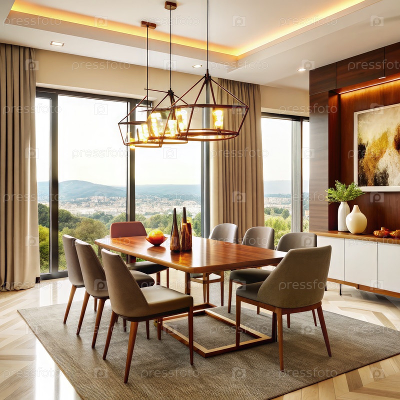 Элегантная современная столовая с большими окнами и живописным видом на городской пейзаж
