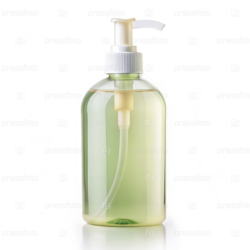 Естественный чистильщик в бутылке с прозрачным насосом, изолированный на белом фоне для использования в личной химии