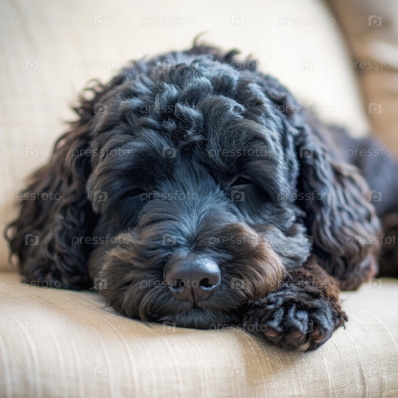 Черный терьер пудель дремлет на бежевом диване в течение дня