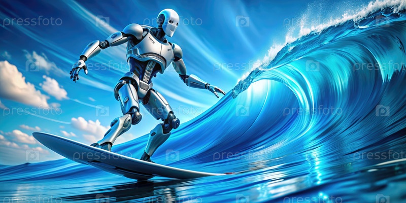 Серебряный робот-серф на синей волне в солнечном небе