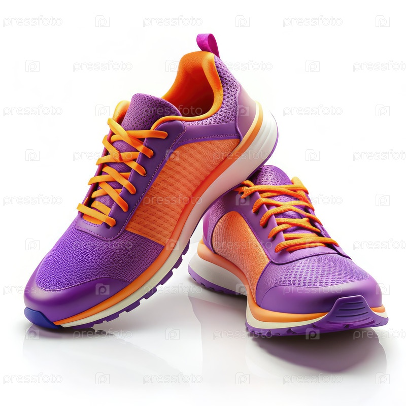 Фиолетовые и оранжевые кроссовки на белом фоне