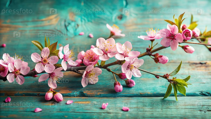 Деликатная макрофотосъемка цветущей ветки вишневого цвета на зеленоватой поверхности. генеративный ИИ