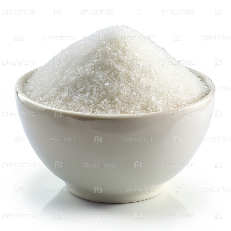 Белый гранулированный сахар в белой чашке на белом фоне