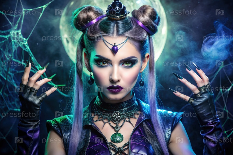 Женщина, одетая в темный характер, позирует перед полнолунием