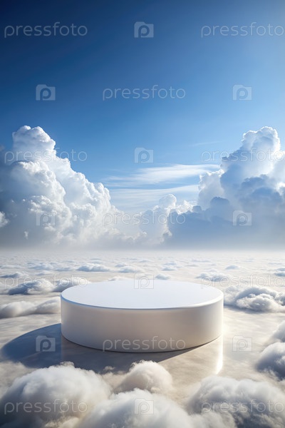 Большой круглый белый подиум, возвышенный среди мягких облаков для демонстрации продукта выше земли