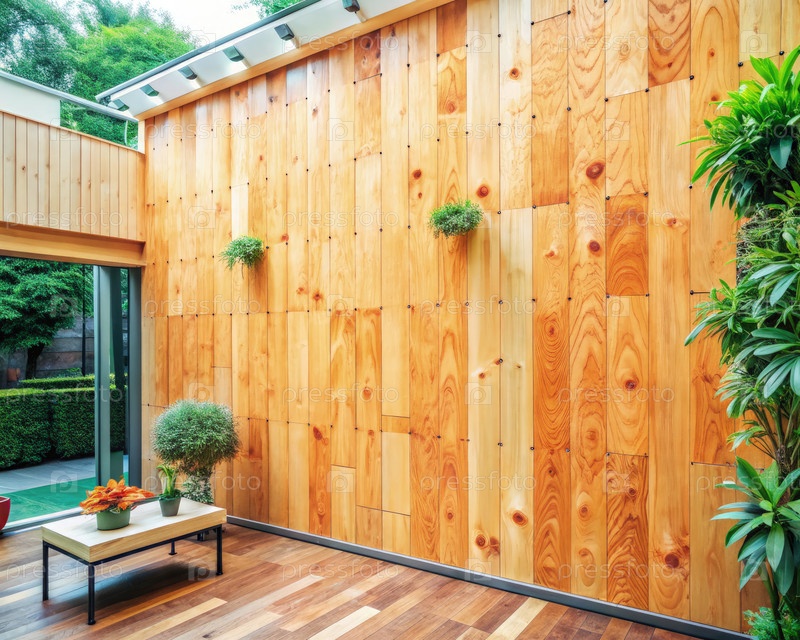 Элегантная деревянная стена в современном внутреннем пространстве с растениями и естественным светом