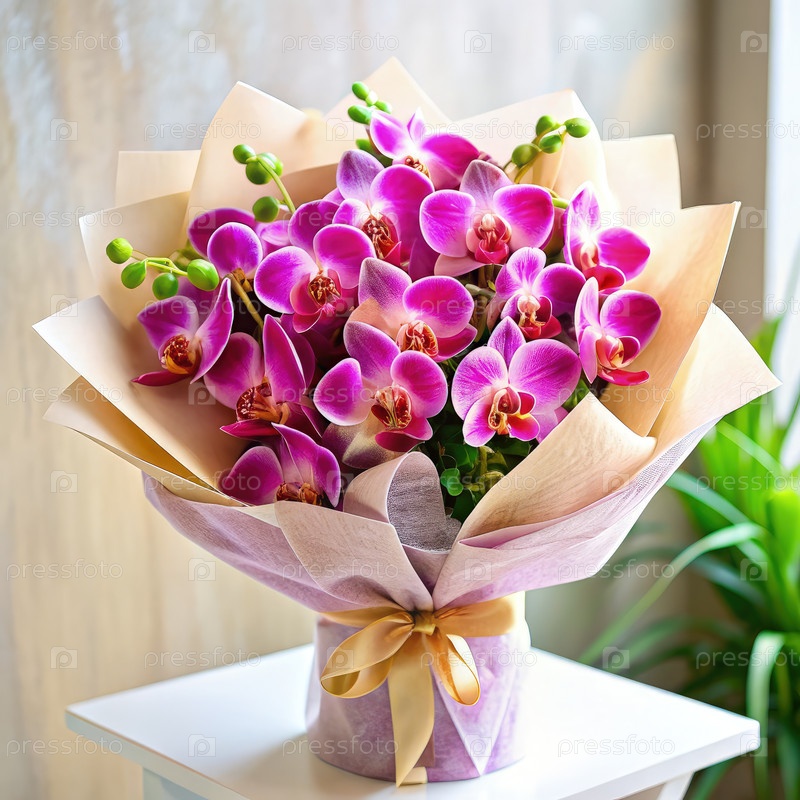 Красиво упакованный букет розовых орхидей для специального подарка