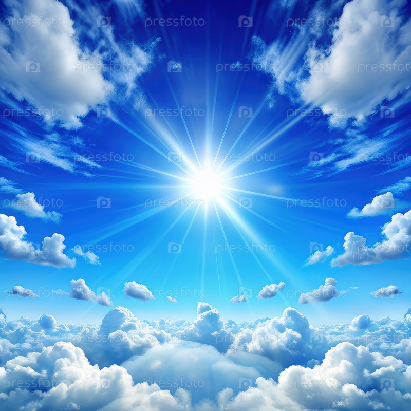 Солнечный свет освещает пушистые облака на светло-синем небе