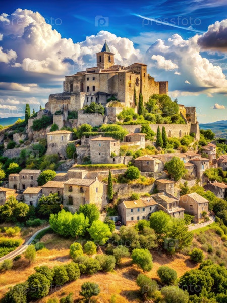 Живописная деревня на вершине холма во французской сельской местности в солнечный день