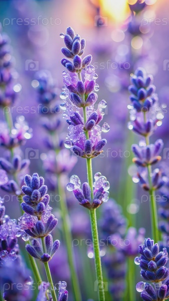 Близкий взгляд на цветы лаванды, покрытые росой в поле при восходе солнца
