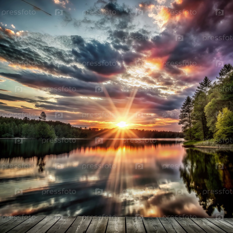 Вибрирующий закат солнца над спокойным озером, окруженный пышными лесами и отражающей водой