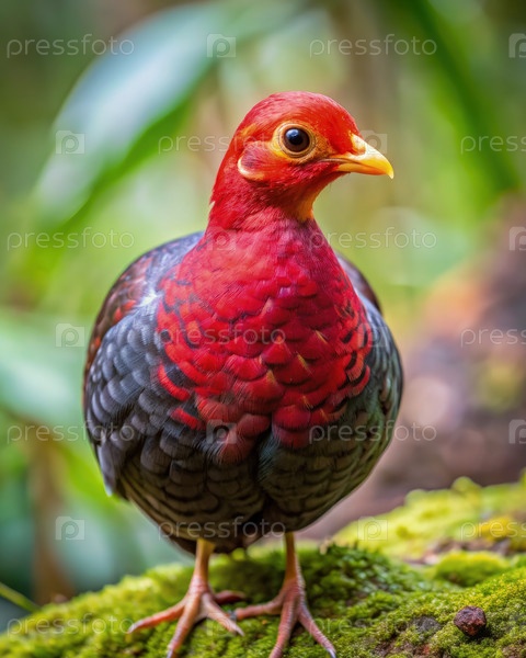 Жестко окрашенный красноватый персик с головой проходит сквозь пышные тропические леса в солнечное утро