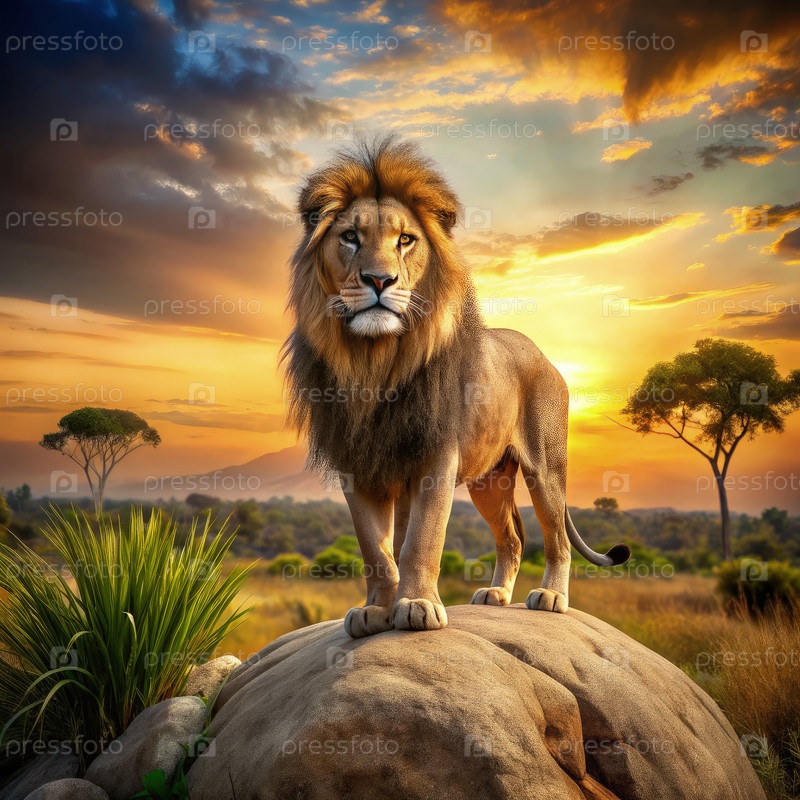 Сильный лев величественно стоит на скале во время потрясающего заката
