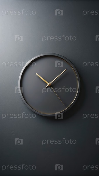 Минималистские черные часовые с золотыми руками на темной стене